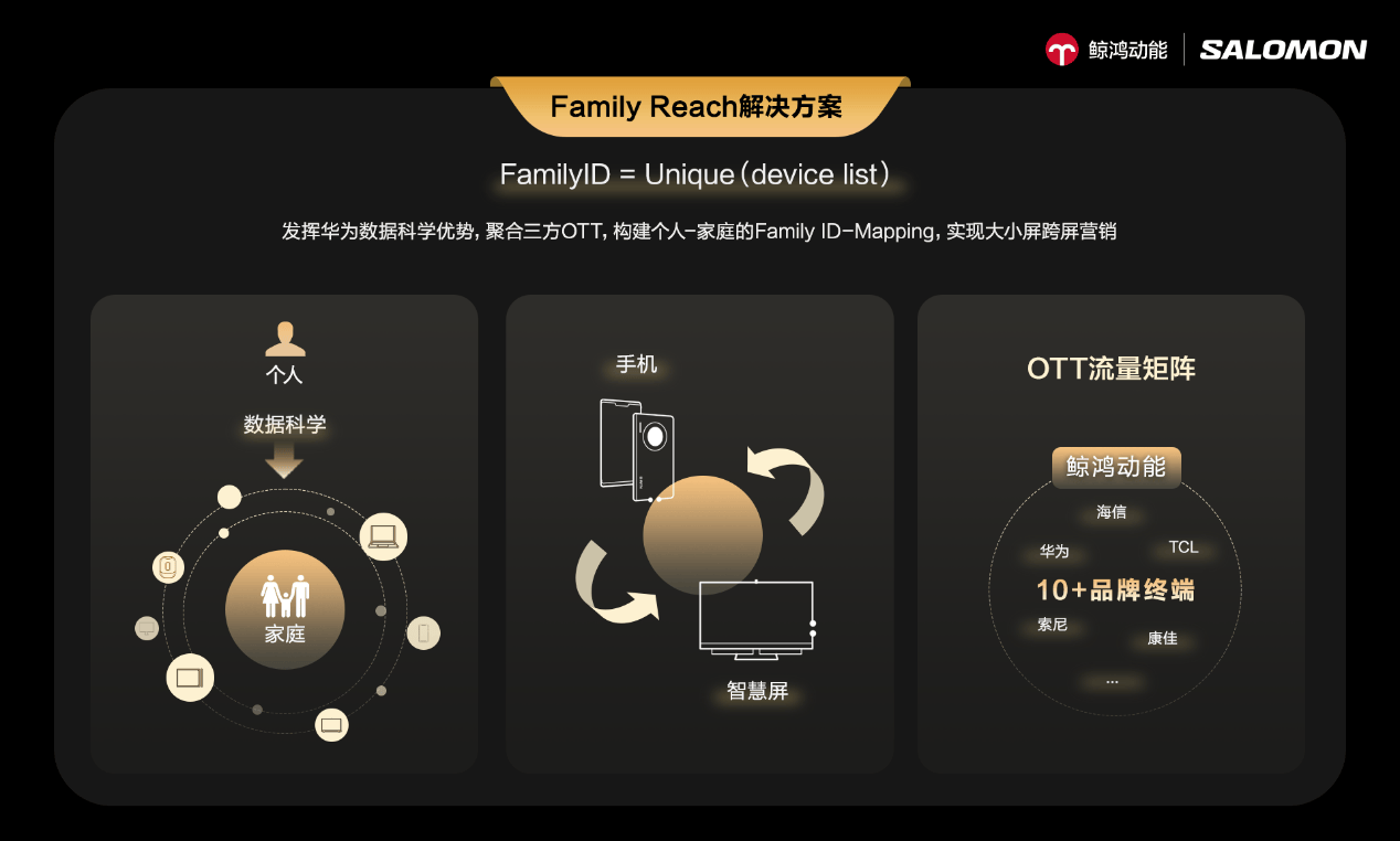 此前,鲸鸿动能已推出覆盖运动健康、出行、睡眠等场景的广告解决方案,作为全场景智慧营销范式又一进展,“Family Reach”的推出,旨在破解家庭营销中大小屏触达割裂、大屏难以精准衡量投放效果,以及无法围绕家庭决策单元进行连贯沟通等核心痛点,为品牌带来更加高效、广泛、深入的营销新解法。